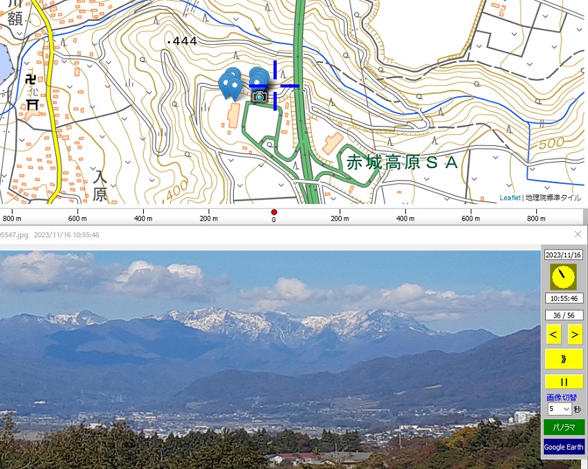 地図画面に写真の撮影場所を表示し、撮影場所からのパノラマを表示 ⇒ 写真と対比 (地図付きスライドショー) |