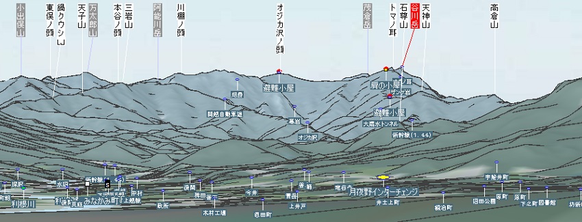 《現地付近の登山計画作成》ボタンを押すと現在表示されている付近の地図画面が出ます。 予定の登山ルートに沿って地図をクリックしていくと行程の概略距離が計算され、同時に高低図が描かれます。 これにより行動距離やアップダウン(高低差など)が計算、表示されるので市販の山岳地図などに記載されていない 初めてのルートを歩くときなど参考になるものと思います。 上図は登山ルートに沿って詳細にクリックしていますが要所のみをクリックするだけでも概略の距離や標高差などが 掴めます。また複雑な市街地でも要所をクリックしてHTMLで保存してスマホに入れておけば迷うことなく目的地に辿り着けます。 |